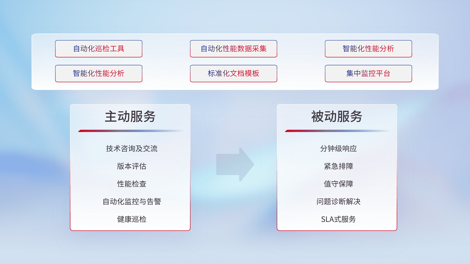 智能化工具和标准化文档,,保障服务质量,,,,提供主动服务(包含技术咨询、、版本评估、、、、性能检查、、、自动化监控与告警、、健康巡检)和被动服务包含(分钟级响应、、、紧急排障、、、值守保障、、问题诊断解决、、、、SLA服务)。。